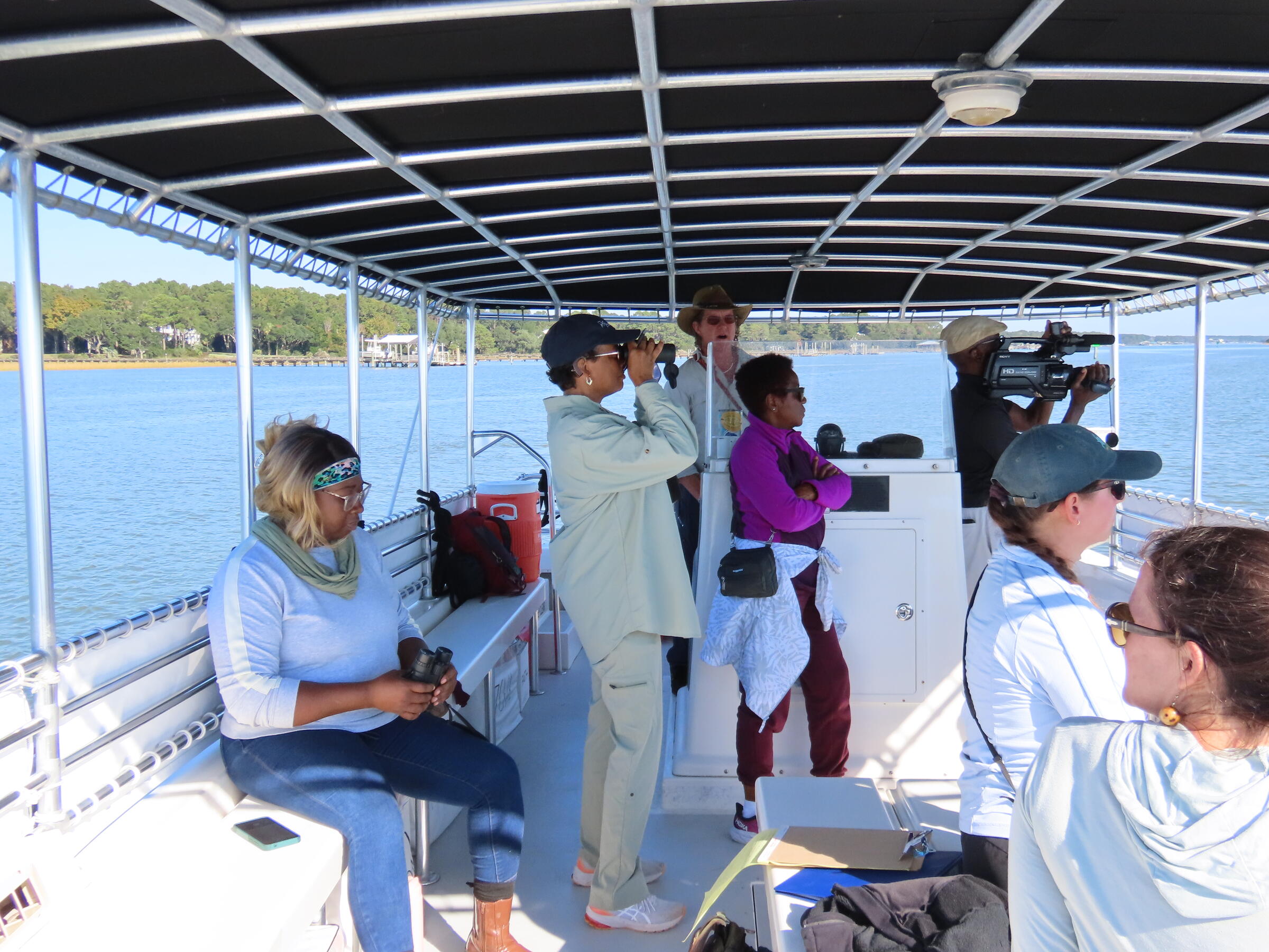 Steering Committee members participated in a boat tour of Cape Romain National Wildlife Refuge on November 8, 2025. This helped everyone understand the importance of habitats and waters to communities and cultures, wildlife, and the overall resilience picture for this area. Photo: Audubon South Carolina